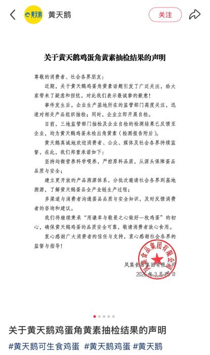 敏捷对相关产物组织抽检,并于3月25日发布抽检成果。黄天鹅发布角黄素抽检成果声明并附检测演讲。